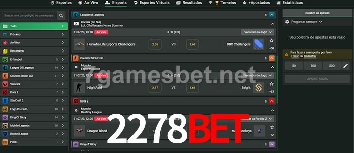 O 2278Bet oferece uma grande seleção de opções de apostas em e-sports com probabilidades competitivas